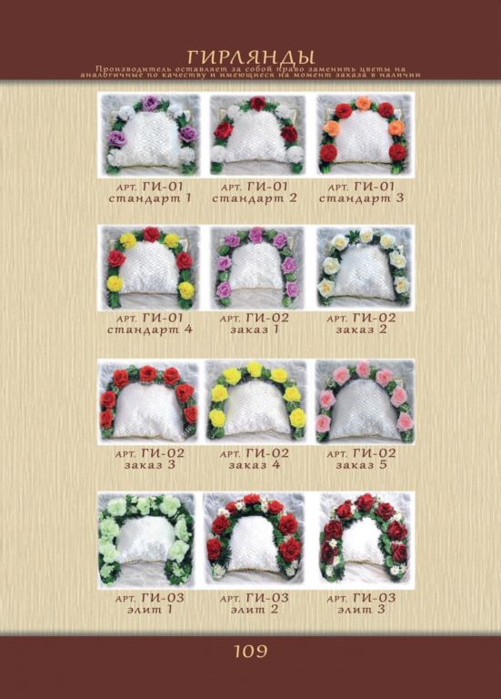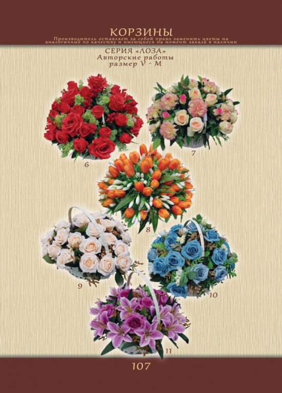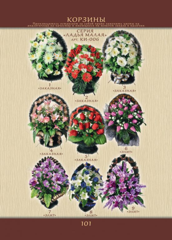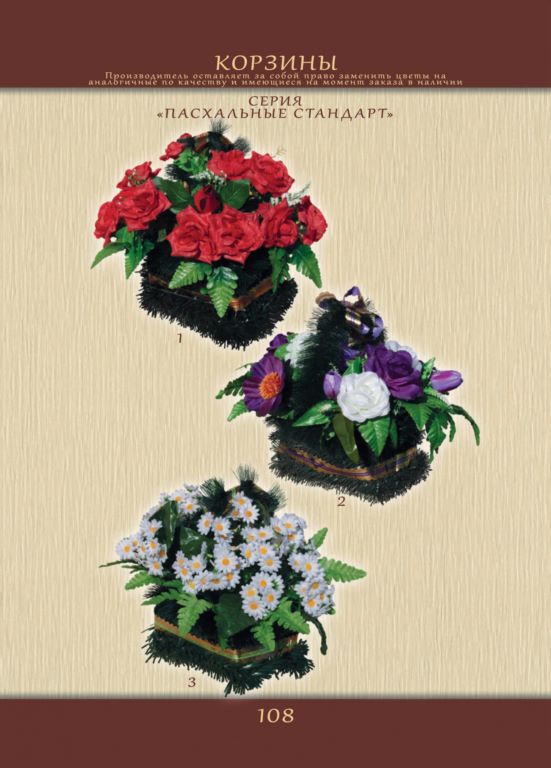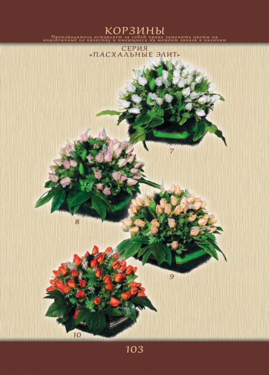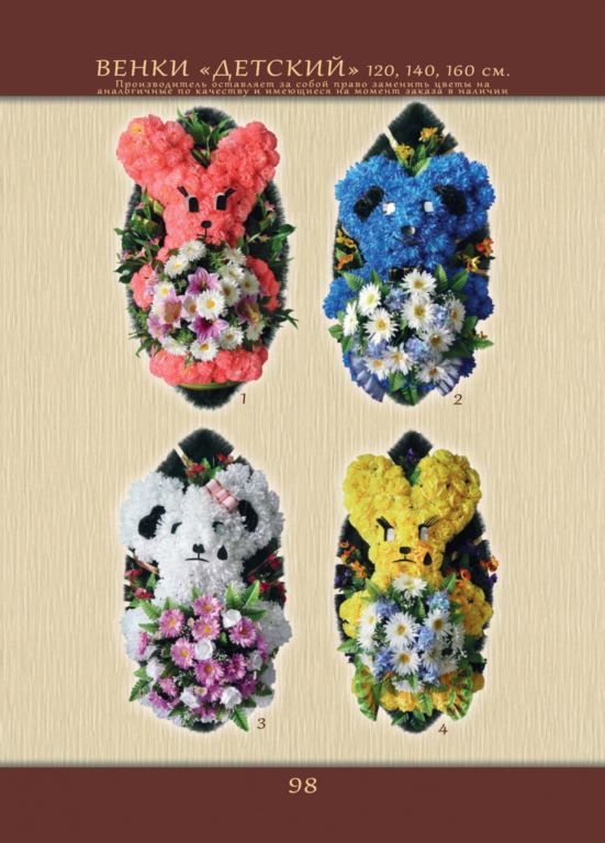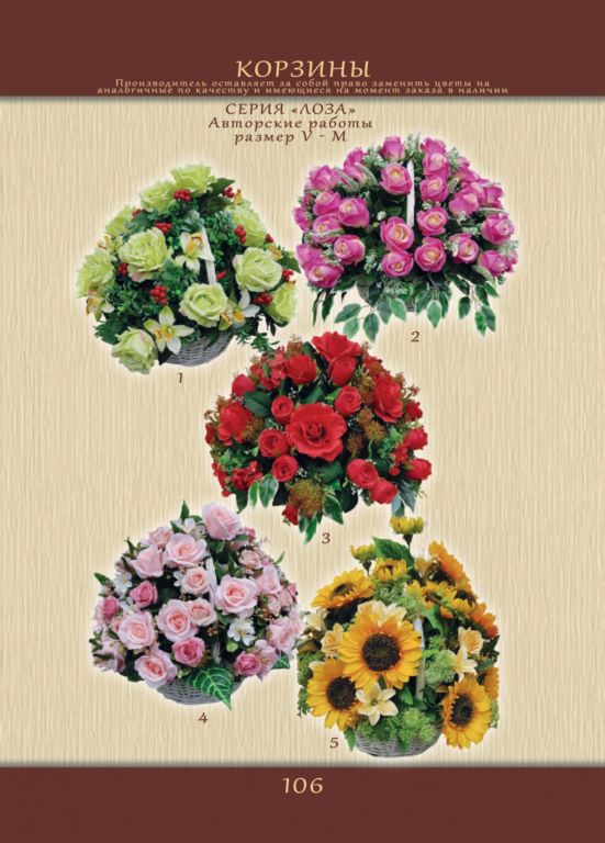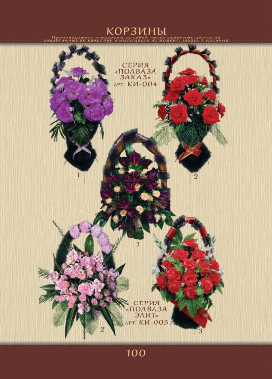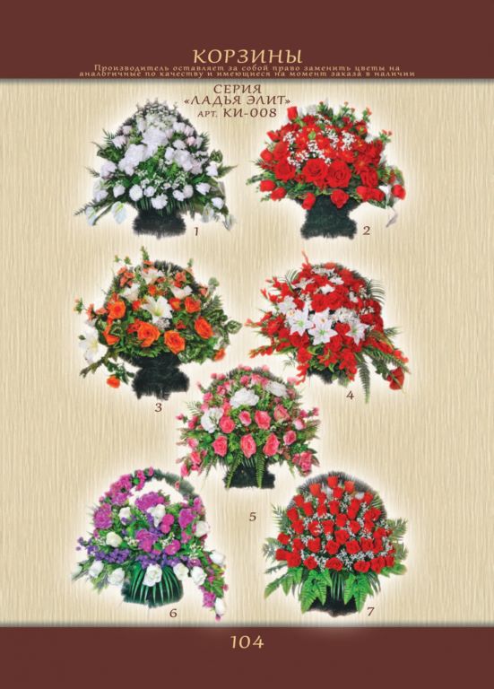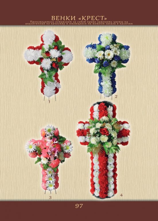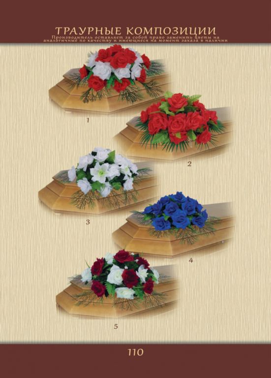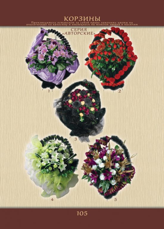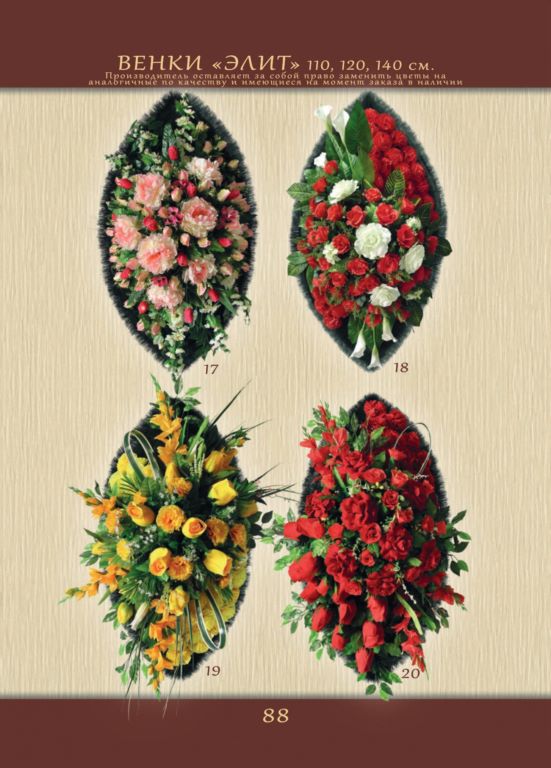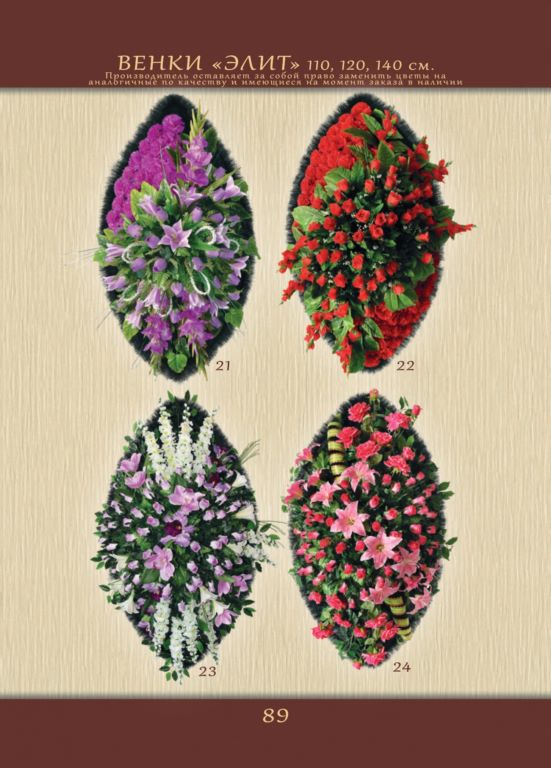 Корзины и гирлянды из искусственных или живых цветов подходят для возложения у гроба или на могиле. Композиции оформляются в классическом или индивидуальном стиле, возможен выбор цвета, размера и наполнения.