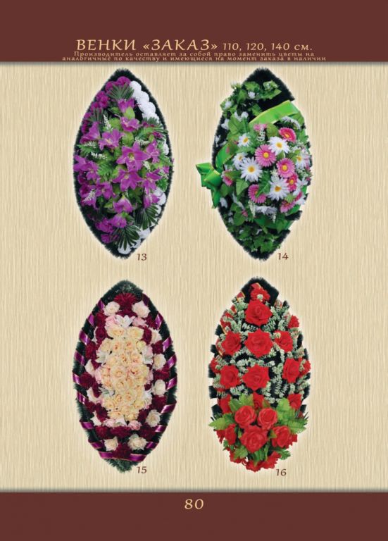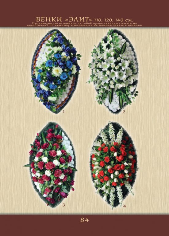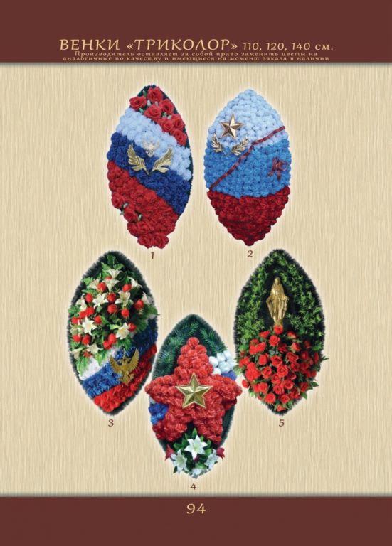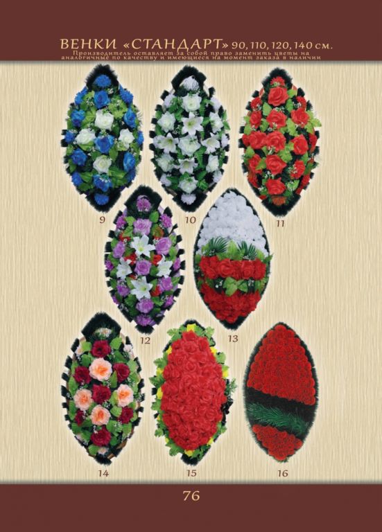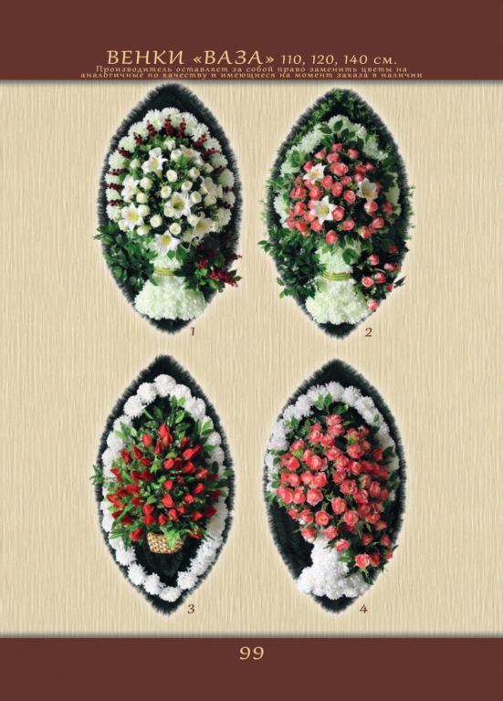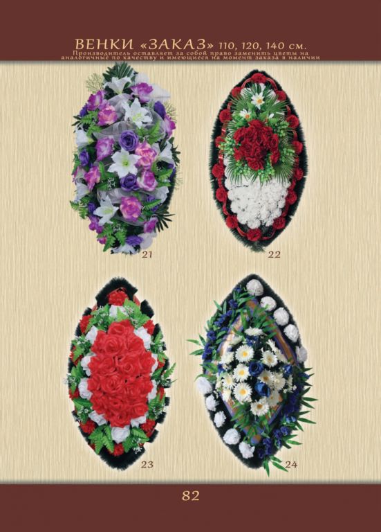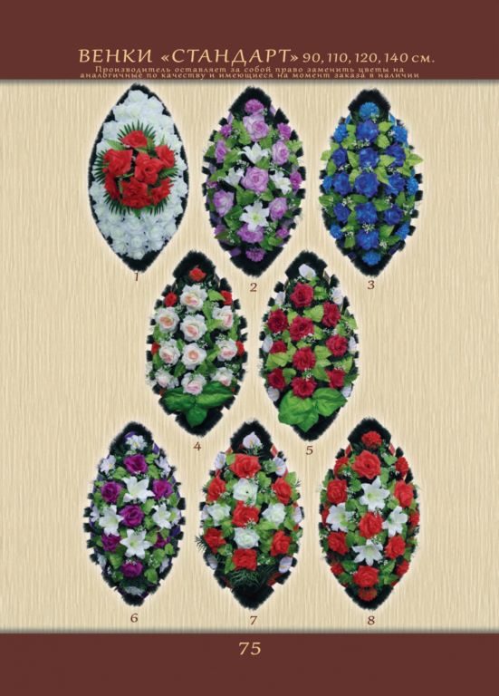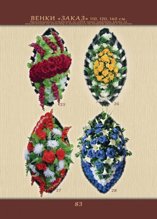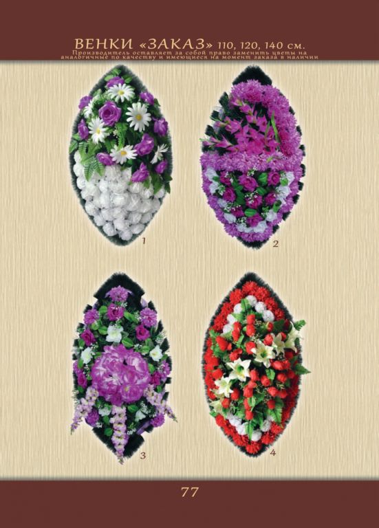 Мы изготавливаем венки вручную, с надписями на траурных лентах, возможна индивидуальная композиция по вашему заказу. Венки устойчивы к погодным условиям, подходят как для церемонии прощания, так и для установки на могиле.