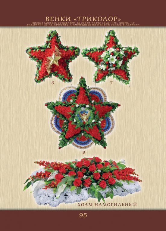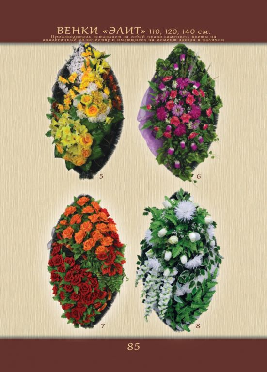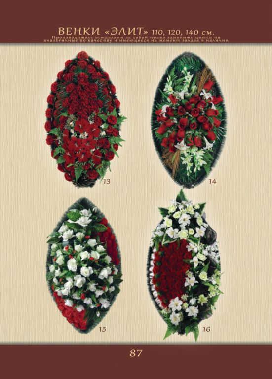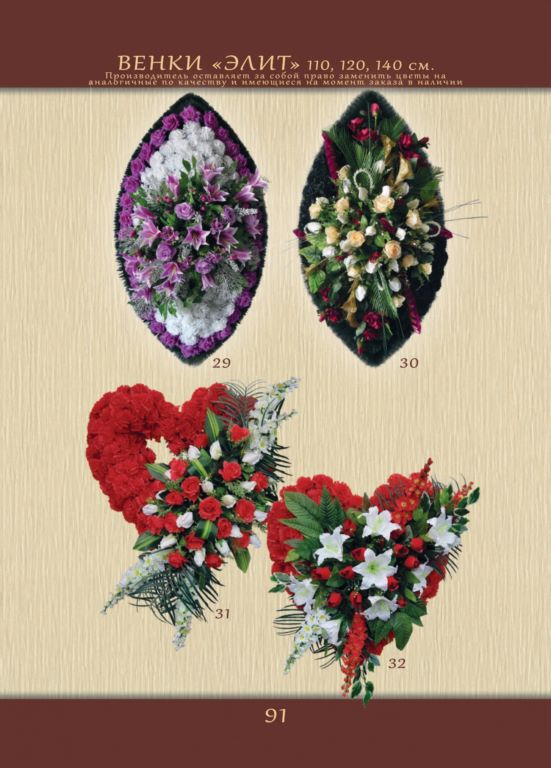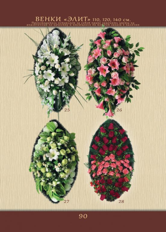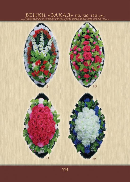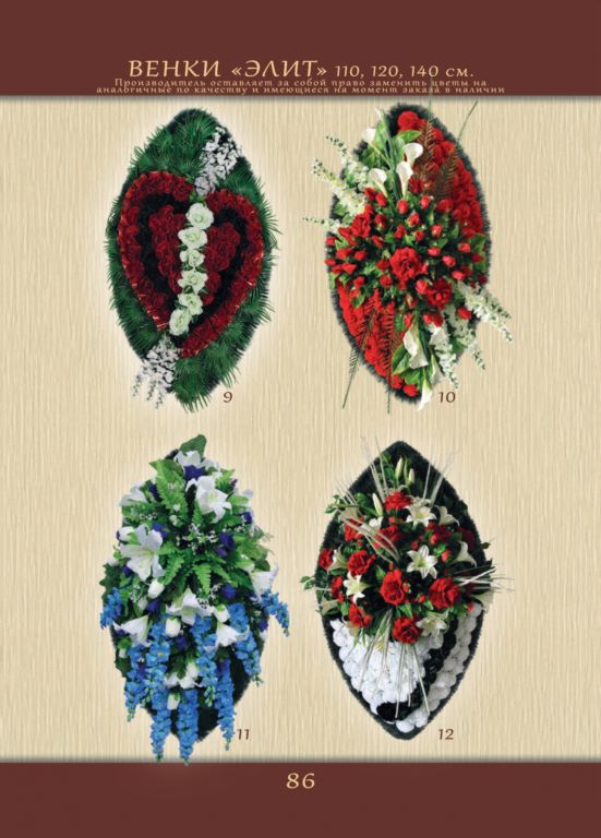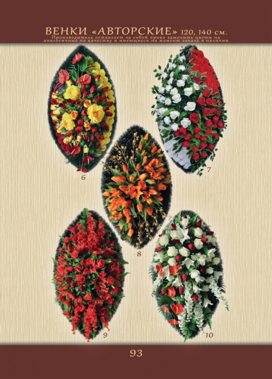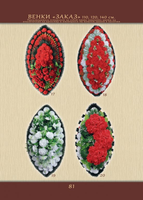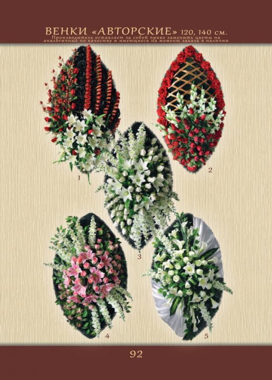 Мы изготавливаем венки вручную, с надписями на траурных лентах, возможна индивидуальная композиция по вашему заказу. Венки устойчивы к погодным условиям, подходят как для церемонии прощания, так и для установки на могиле.