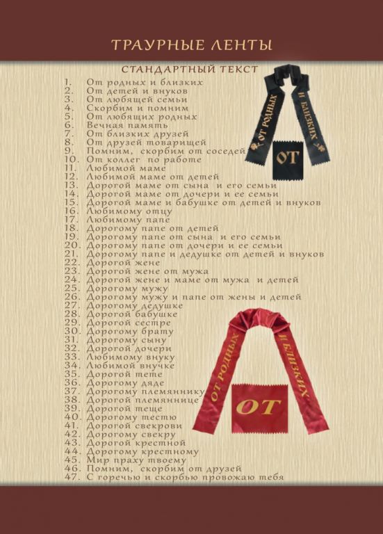 Траурные ленты изготавливаются с надписями по вашему тексту — от имени родных, друзей, коллег. Все изделия устойчивы к погоде, выглядят достойно и уместно.
