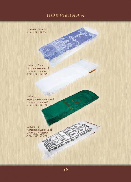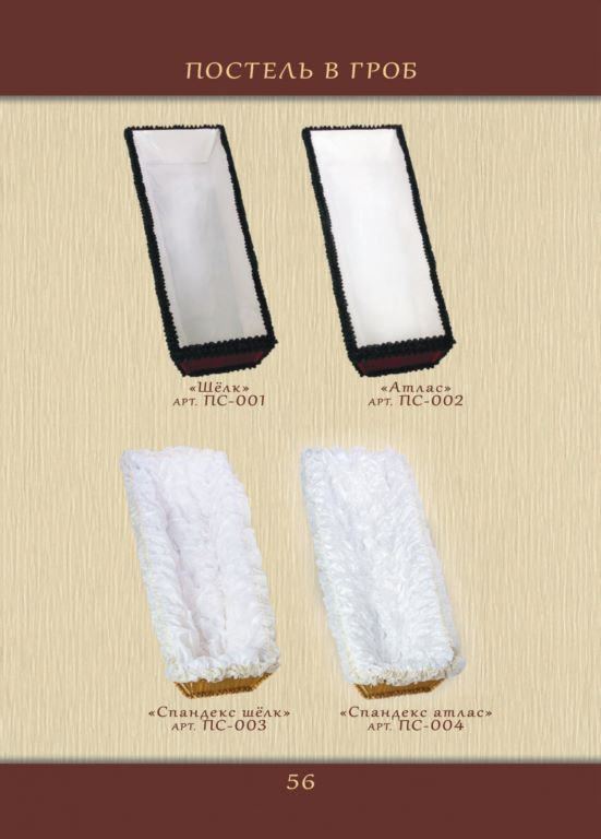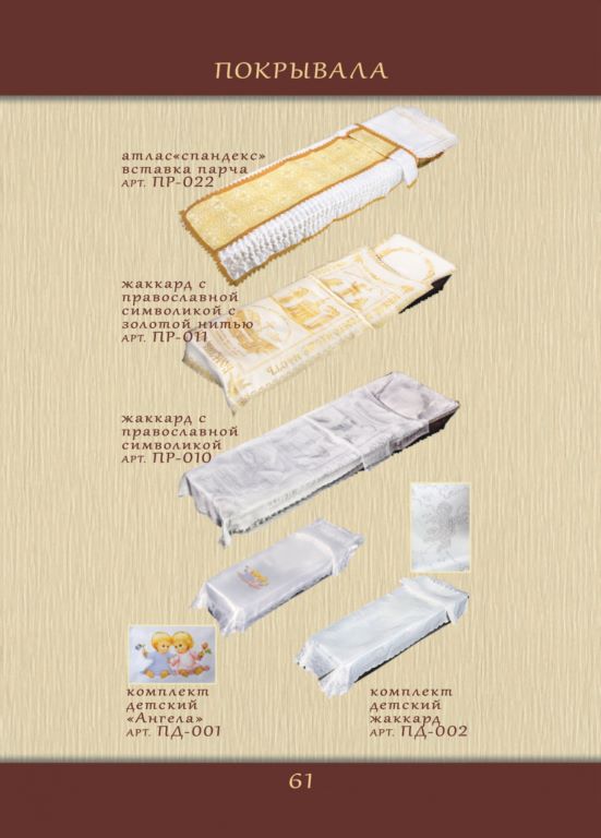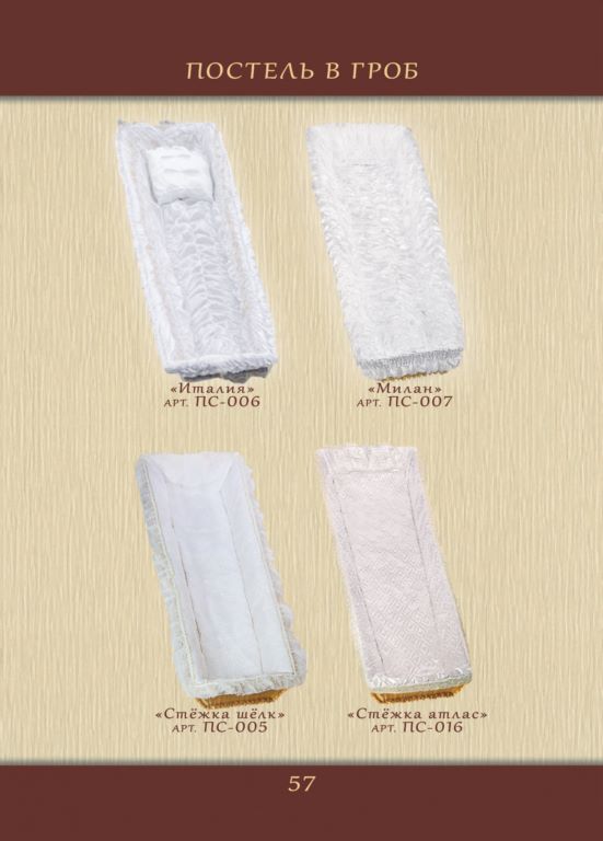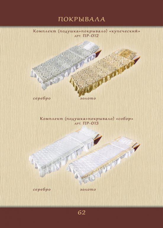 Фурнитура, постель в гроб, покрывала, подушки, одежда